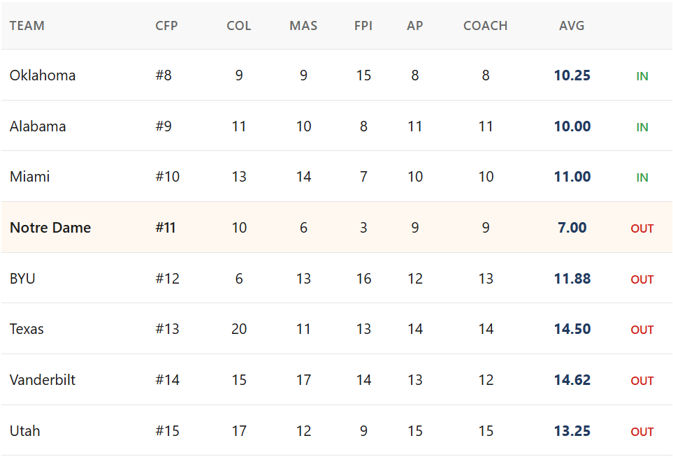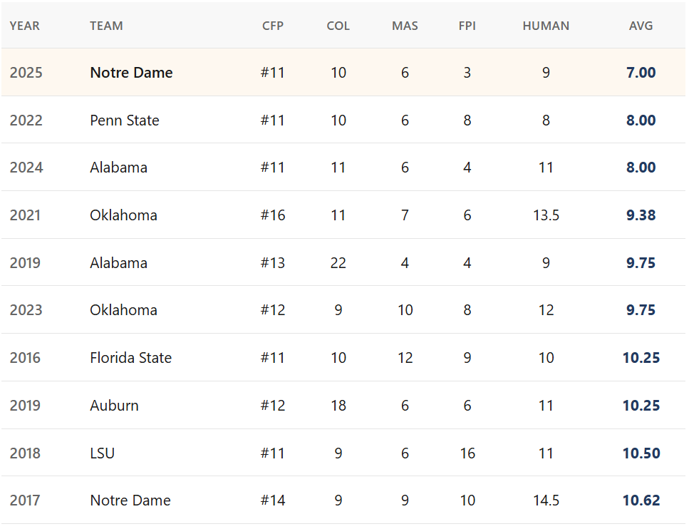 And when you zoom out to the historical context, the four philosophies have never been so sure—and so in sync—about a team left outside the top 10 as they were about Notre Dame in 2025. Here are the ten best four-system averages in CFP history for teams that finished outside the top 10: