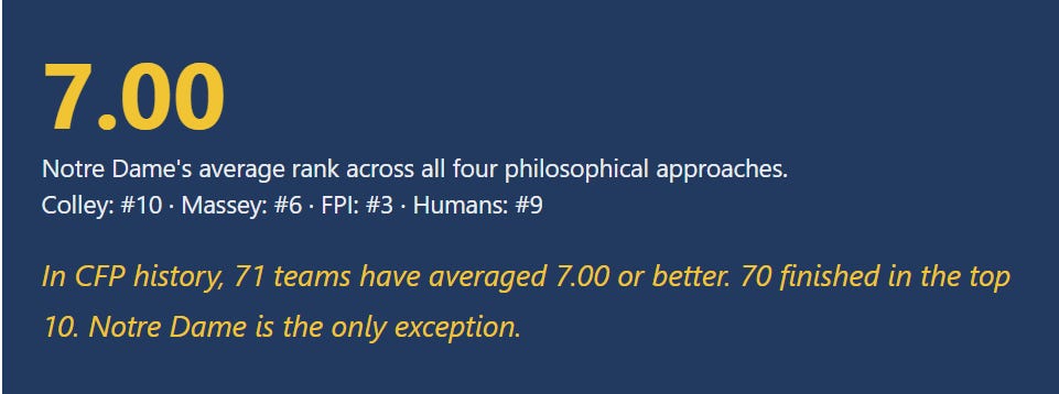 They weren’t. Notre Dame ranked in the top 3 of the bubble in Colley. In Massey. In FPI. In the AP Poll. In the Coaches Poll. Five different ways of evaluating teams—three algorithmic, two human—and all five said Notre Dame wasn’t fighting for the last spot. They were clearly one of the best teams in the at-large conversation, full stop.