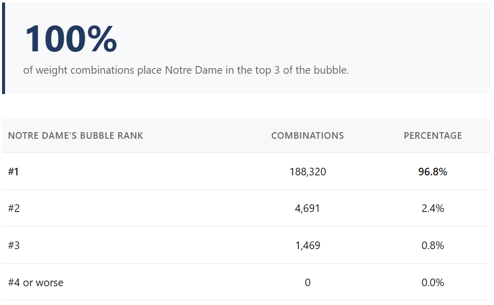 It’s not that Notre Dame usually comes out ahead. It’s that in nearly 97% of scenarios, they’re the #1 team on the bubble—and in the remaining 3%, they’re still #2 or #3. There is no combination of philosophical weights that drops them to #4. Zero out of 194,480.